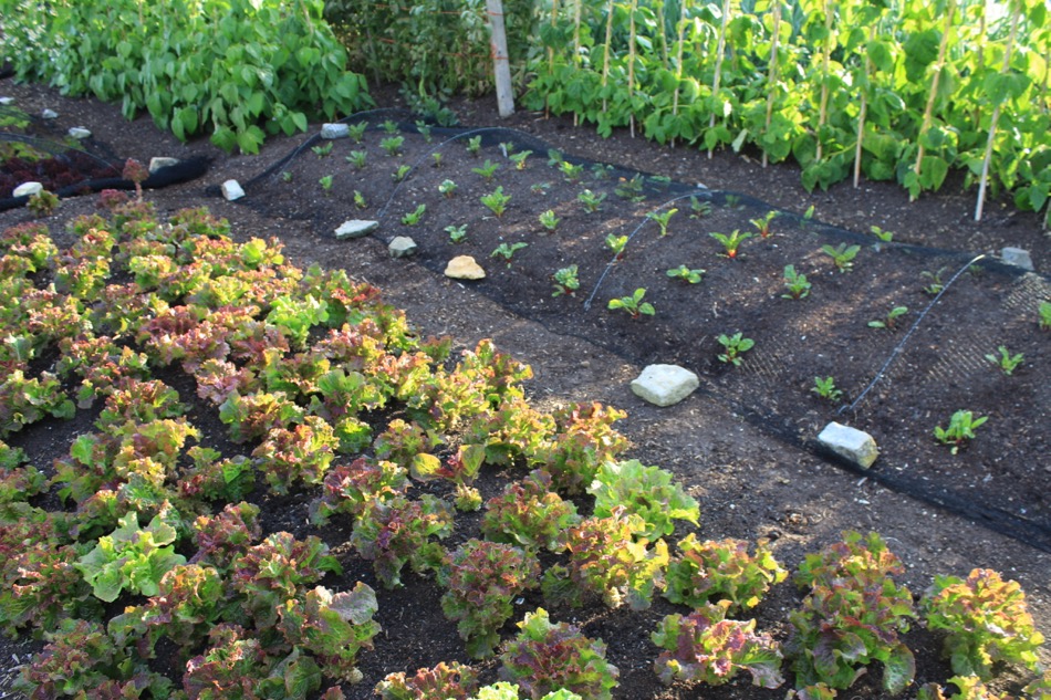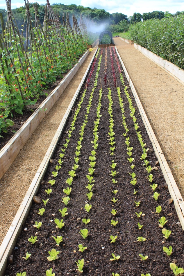 Lettuce picked 12 weeks, new planting of chard, narrow weed-free paths, no sides,