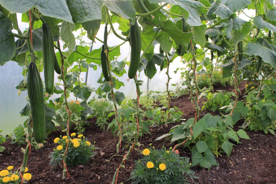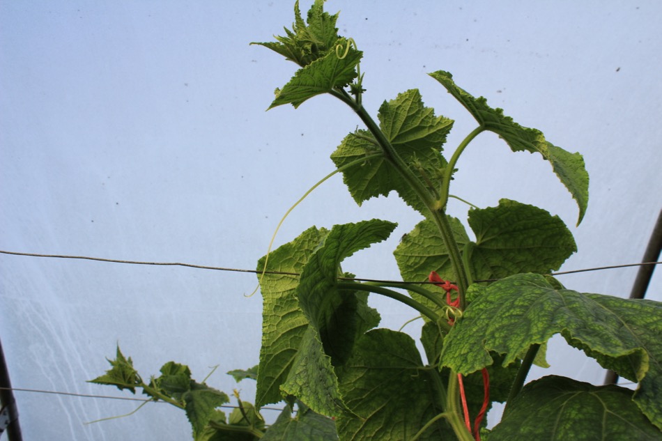 Cucumbers are demanding of water and grow so fast, here they are already going over the polytunnel top wire support at 2m height. I simply encourage the main stem to loop over and then come down again. Some gardeners pinch out the main stem and allow two sideshoots but I find one stem enough. Also I pinch out every other cucumber so that fruits grow steadily, without feast and famine.