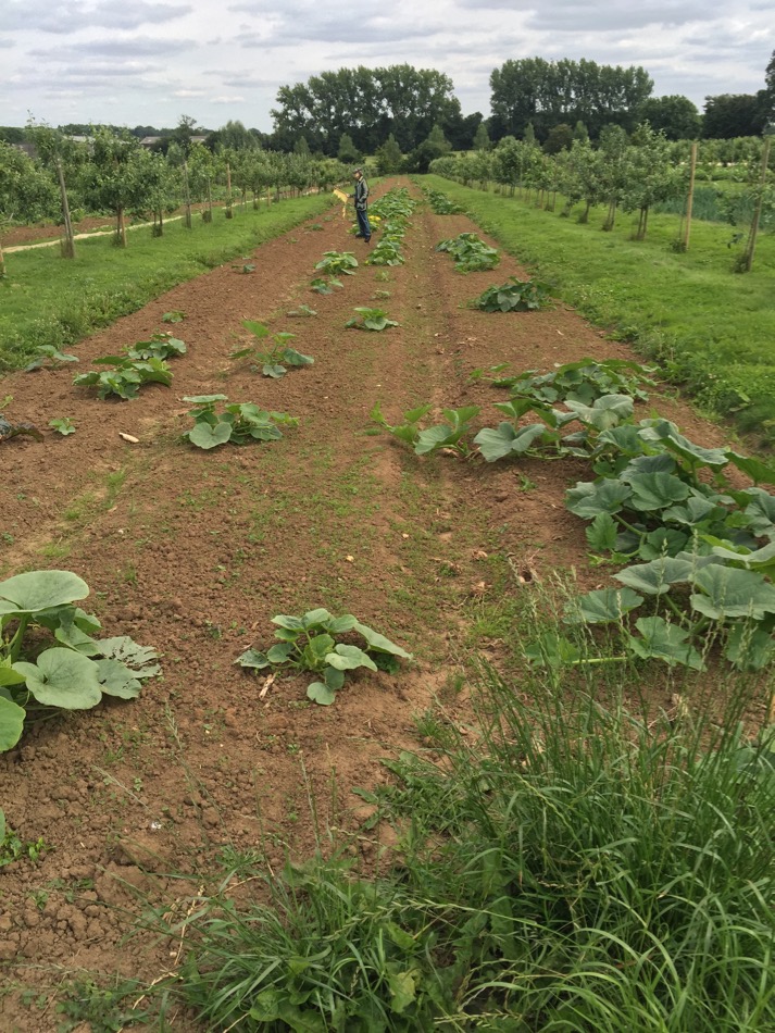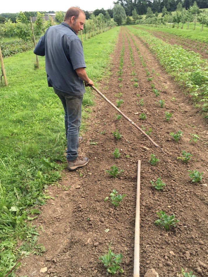 On part of the site are heritage apple trees from Brogdale, purchased by the Prince of Wales. Its a fertile, sandy loam and Fred shapes beds with a special power harrow, three beds between each row of trees. Weeding is mostly by hand and I love his home made hoes, including a bronze one. Some of the beds have gaps where Fred experienced difficulty in making a seed bed during some tricky weather.