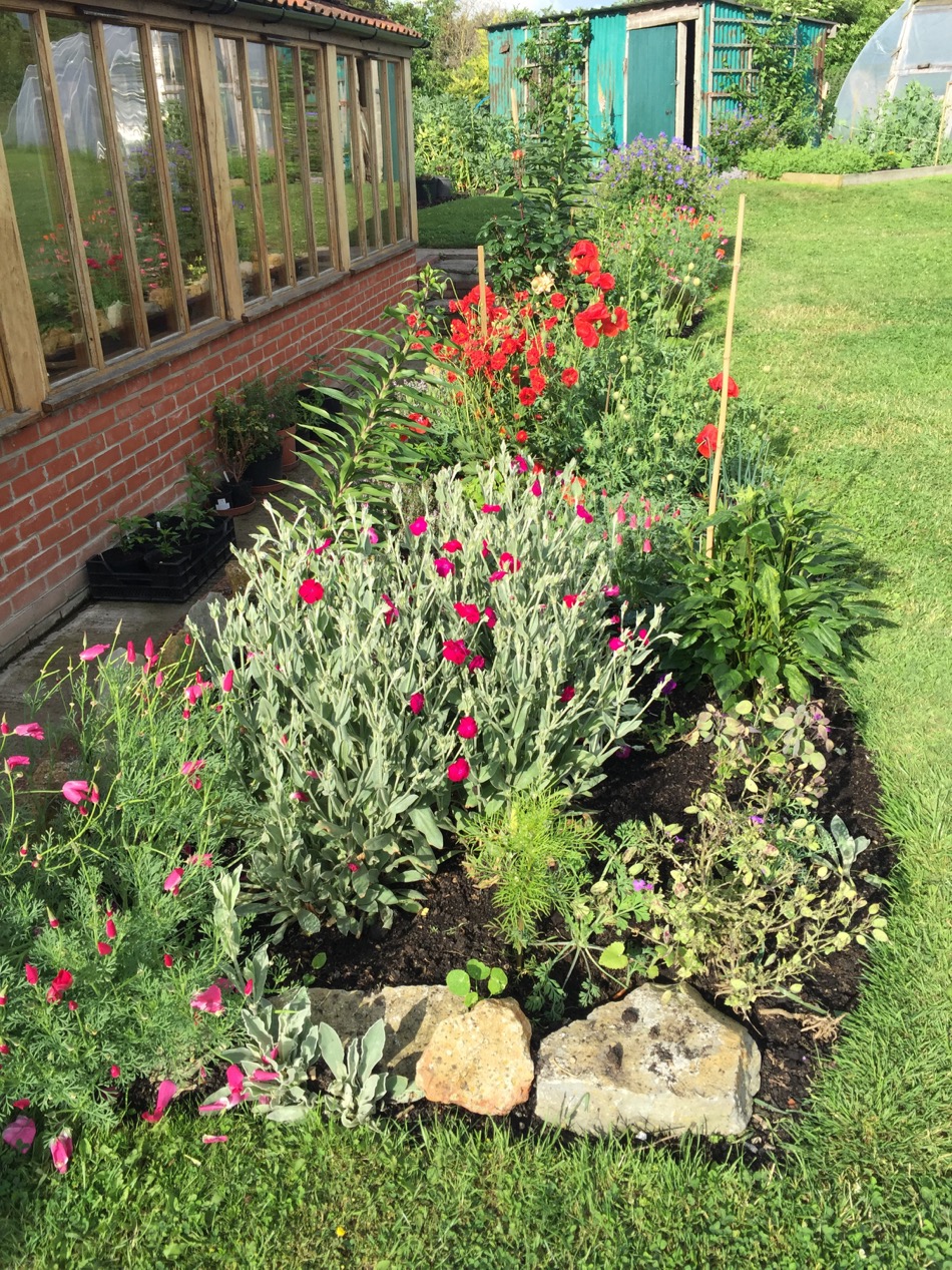 Flower bed by the conservatory, pink escholzia and red lychnis in front
