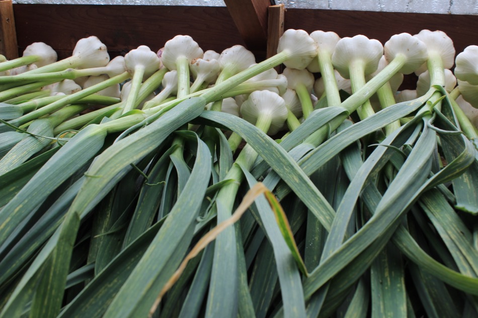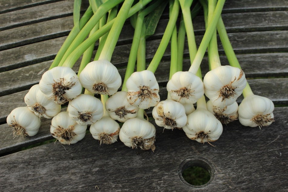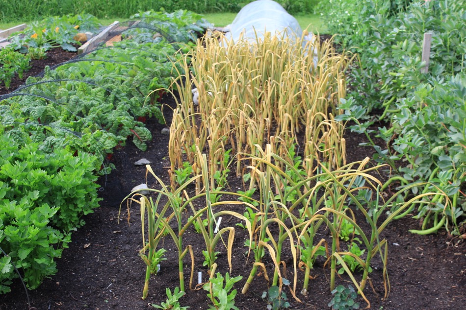 Most softneck garlic wants harvesting by the end of June, when many leaves are still green, or by mid July for some hardbacks mostly.