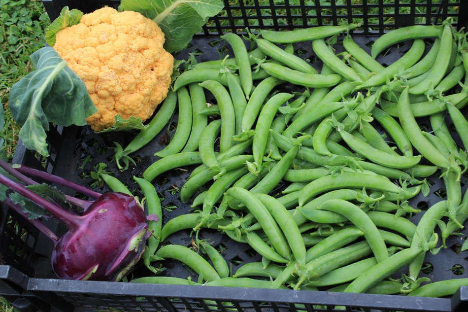 Kohlrabi, Sunset cauli, snap pea Delikett. The cauliflower is not growing under mesh because its ready to harvest before the butterflies have arrived