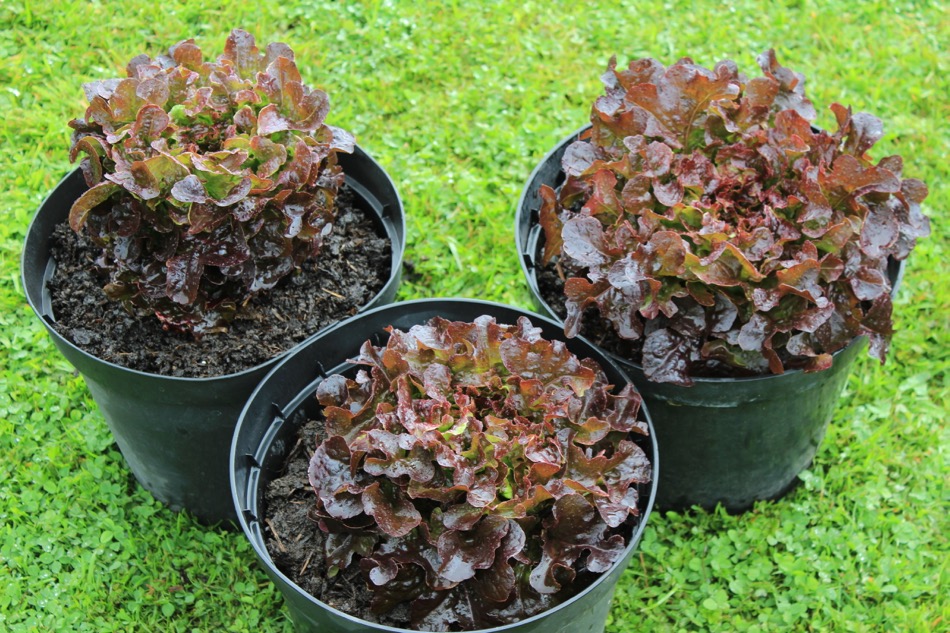 Navarra lettuce in cow manure on left, fine homemade compost on right, lumpy homemade in middle