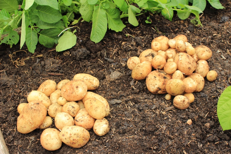 Rocket potatoes June 13th, dug bed on left, undug bed on right