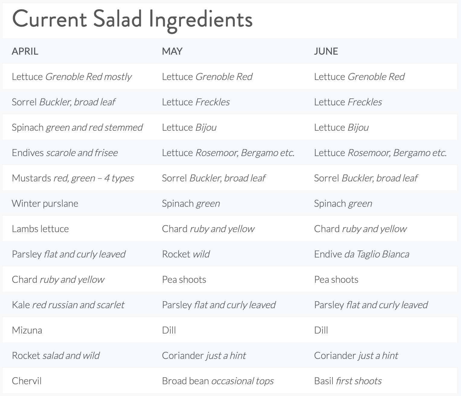 Spinach, lettuce, chard, spring cabbages and onions, beetroot, parsley, dill, coriander, asparagus, rhubarb, early potatoes; then broad beans, peas, carrots, courgettes and calabrese after about mid month.