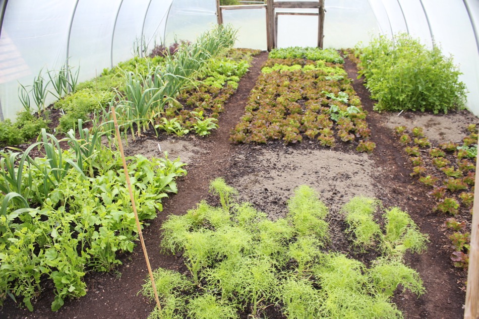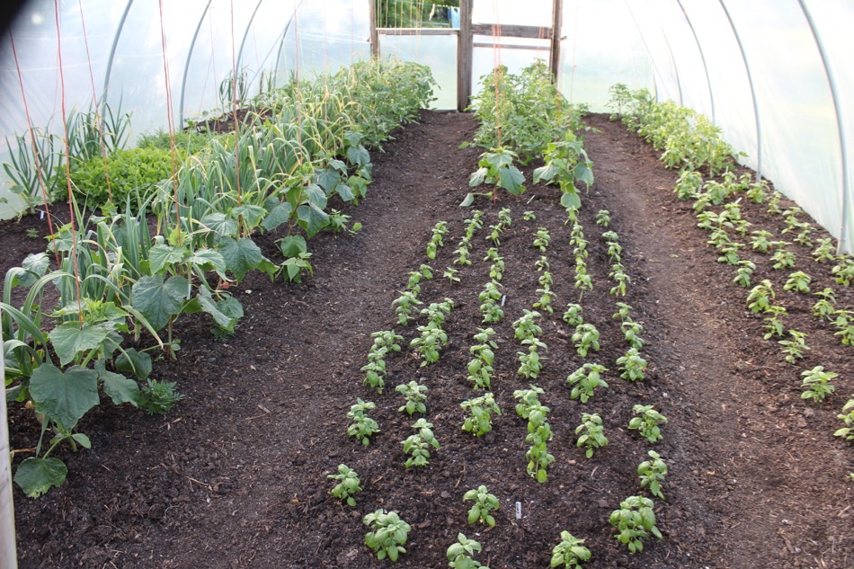 Polytunnel on May 31st, surface compost and plantings of cucumber, tomato, basil, French bean