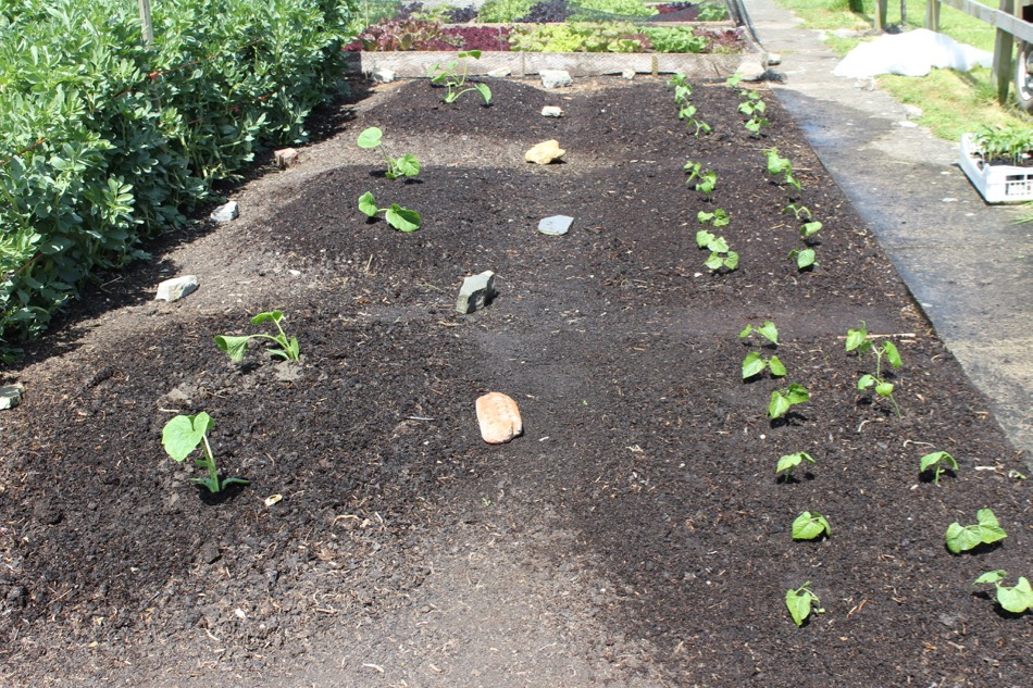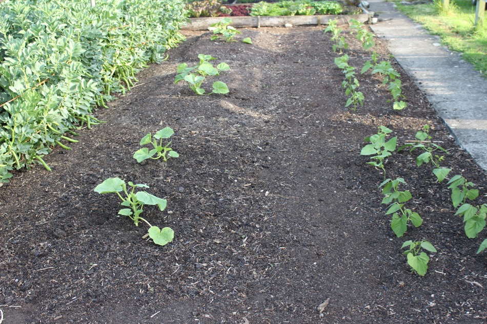 Thanks to Felix’s help, another compost heap has replaced the one he spread already, just 26 days from assembling it. He spread it, five large wheelbarrows, on a weedy area that had been mulched with polythene for six weeks, two inches deep and with an inch of old cow manure on top. Then we planted Crown Prince squash through holes in the polythene.
