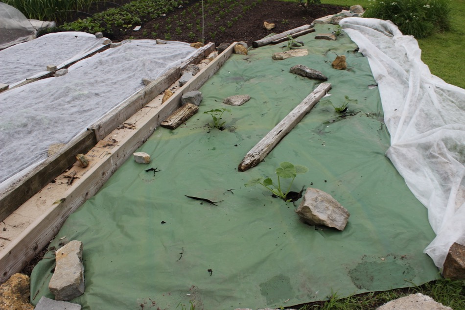 The area, still weedy, recovered with polythene, Crown Prince planted