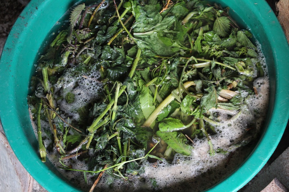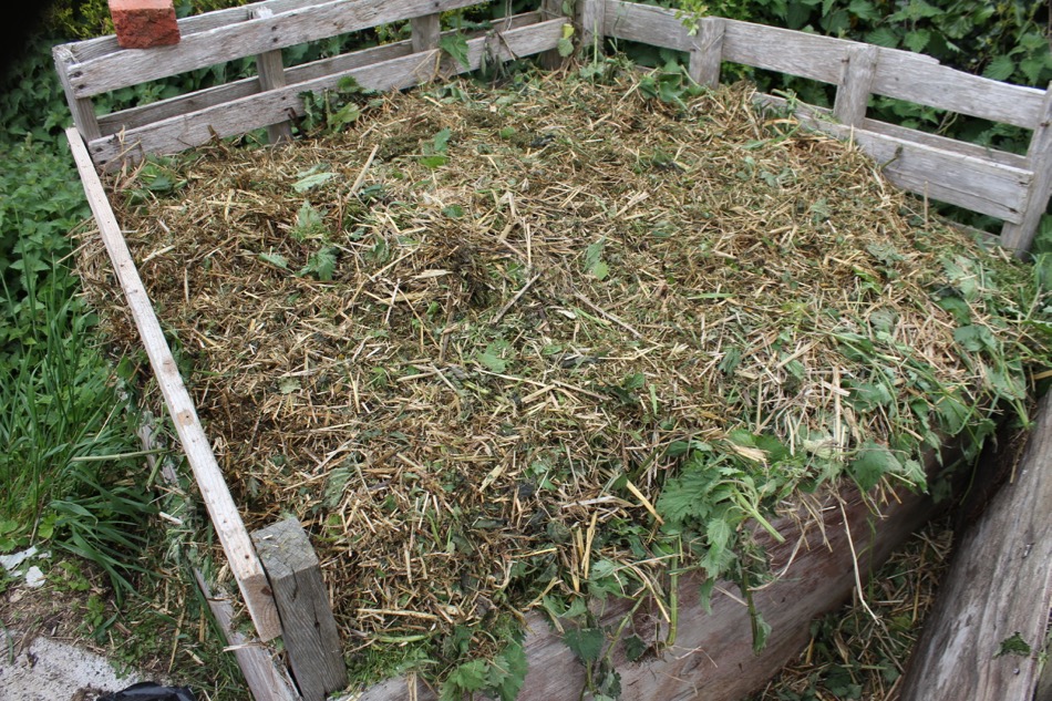 The new heap is 60% green (nettles and grass) and 40% brown (straw, fresh horse manure, small wood chip and pine needles). The difference this time is that we added no water, after finding the previous heap too wet towards the end, which meant too little air. I think this caused its heat to suddenly dissipate after 22 days.