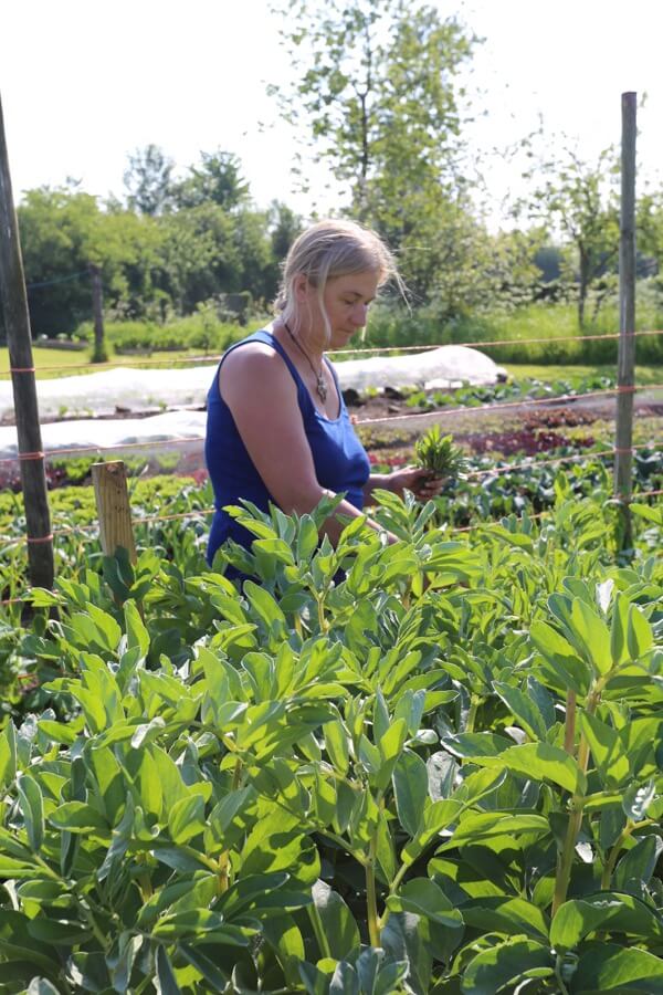 Steph pinching the tops of broad beans before blackfly find them and to encourage pod growth