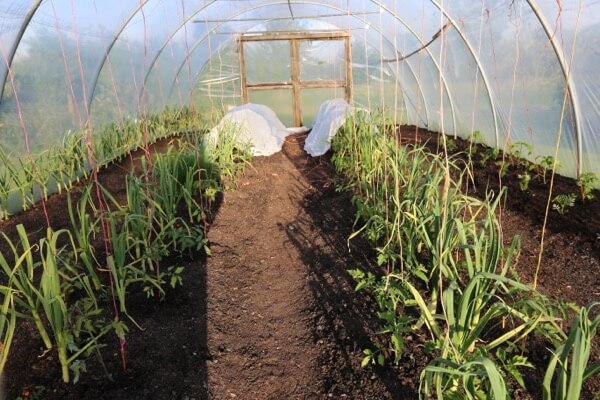 Tunnel 17th May before a cold night, fleece over new planting of cucumber