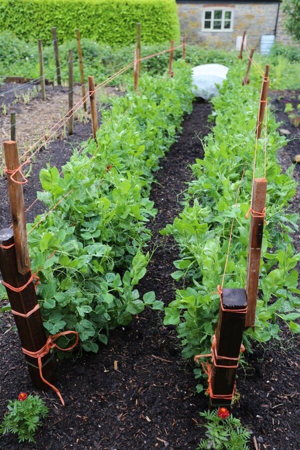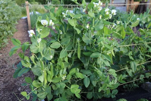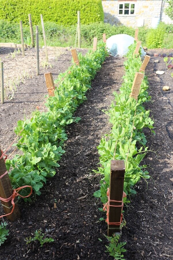 Mangetout peas Delikata sown early March & planted late March, fleeced