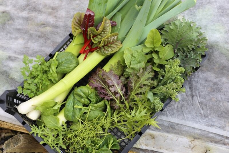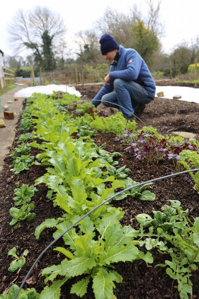 Overwintered mustards, corn salad, rocket which have grown well under mesh and yielded 3kg saleable leaves so far