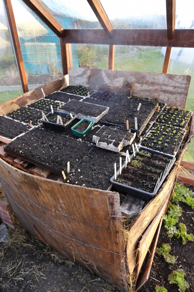 We sowed thousands of seeds on 20th February, a day after assembling the hotbed, and some are emerging such as lettuce, cabbage and radish. We have sown only vegetables that are frost hardy, because after 2 weeks or so on the hotbed, they move to a bench in the unheated greenhouse, where it’s icy by night in this weather.