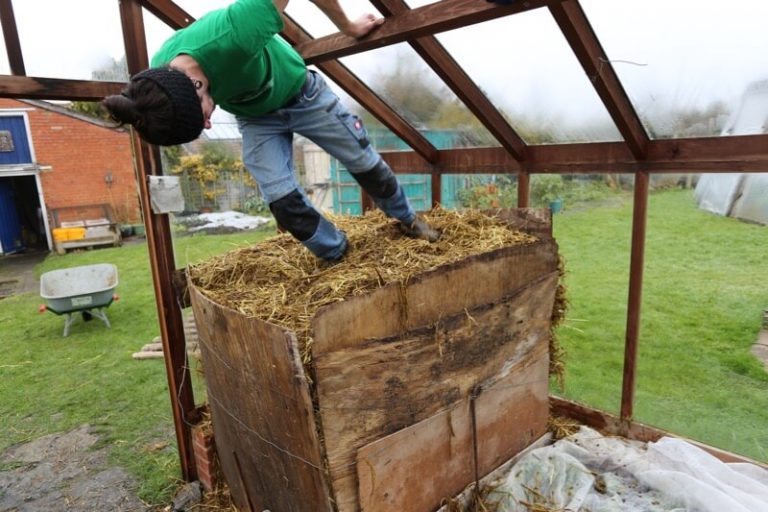 Josh and I went foraging in the nearby wood for some old twigs and small branches, then some finer twigs to place on them, then some old (half decomposed) grass & moss, then some soil/compost from a waste heap where a neighbour had thrown her grass and weeds over the fence, then some old cow manure, homemade compost, green waste compost and mushroom compost.