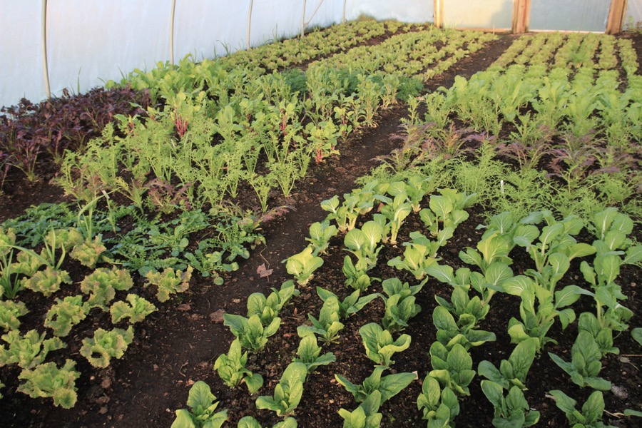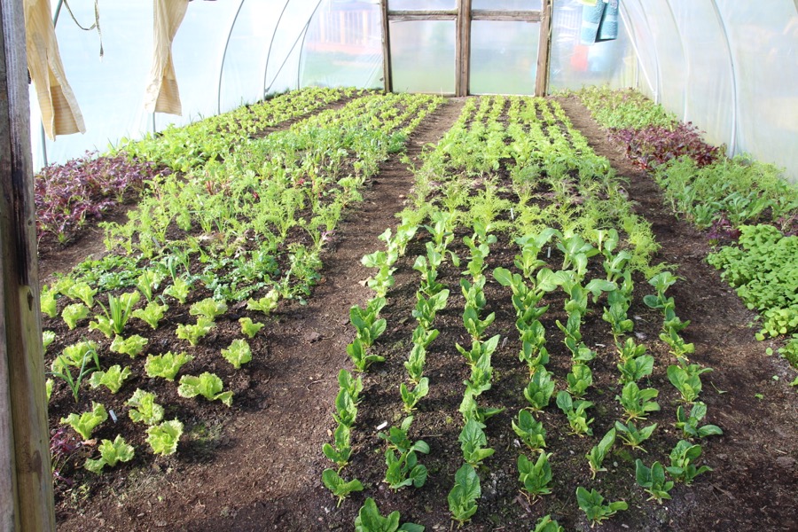 Homeacres polytunnel of 18x30ft (5.5x9m) gave a pick of 18kg salad leaves on 23rd February. For most plants it was the fifth or sixth time they have been picked, and there are many more harvests to come over the next two months.This growth is achieved without any feeding since the last application of compost in May, before we planted summer crops. The joy of using compost rather than fertilisers and feeds is that nutrients are held, without being leached by water, until plants need them.Furthermore, no dig ensures that mycelial networks are in place for plants to access nutrients, and moisture, more easily than if soil had been disturbed, even by forking rather than digging. The harvests of a forked soil/no dig trial here last year were 120.33kg from the forked strip and 142.14kg from no dig: same crops, same compost, both strips 2x9m (6.5x19.5ft).