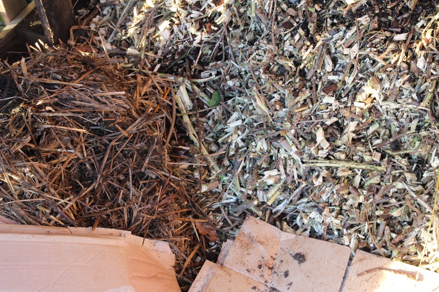 Brown ingredients (card, straw, shredded wood) waiting for summer green