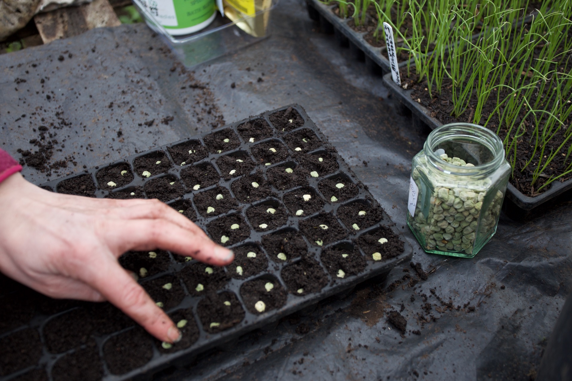 I transplant most seedlings from my module trays at about four weeks old, but sometimes less, straight into dibbed holes. There are very few vegetables that I pot on. Check out my long-handled dibber for making it easy to dib holes.