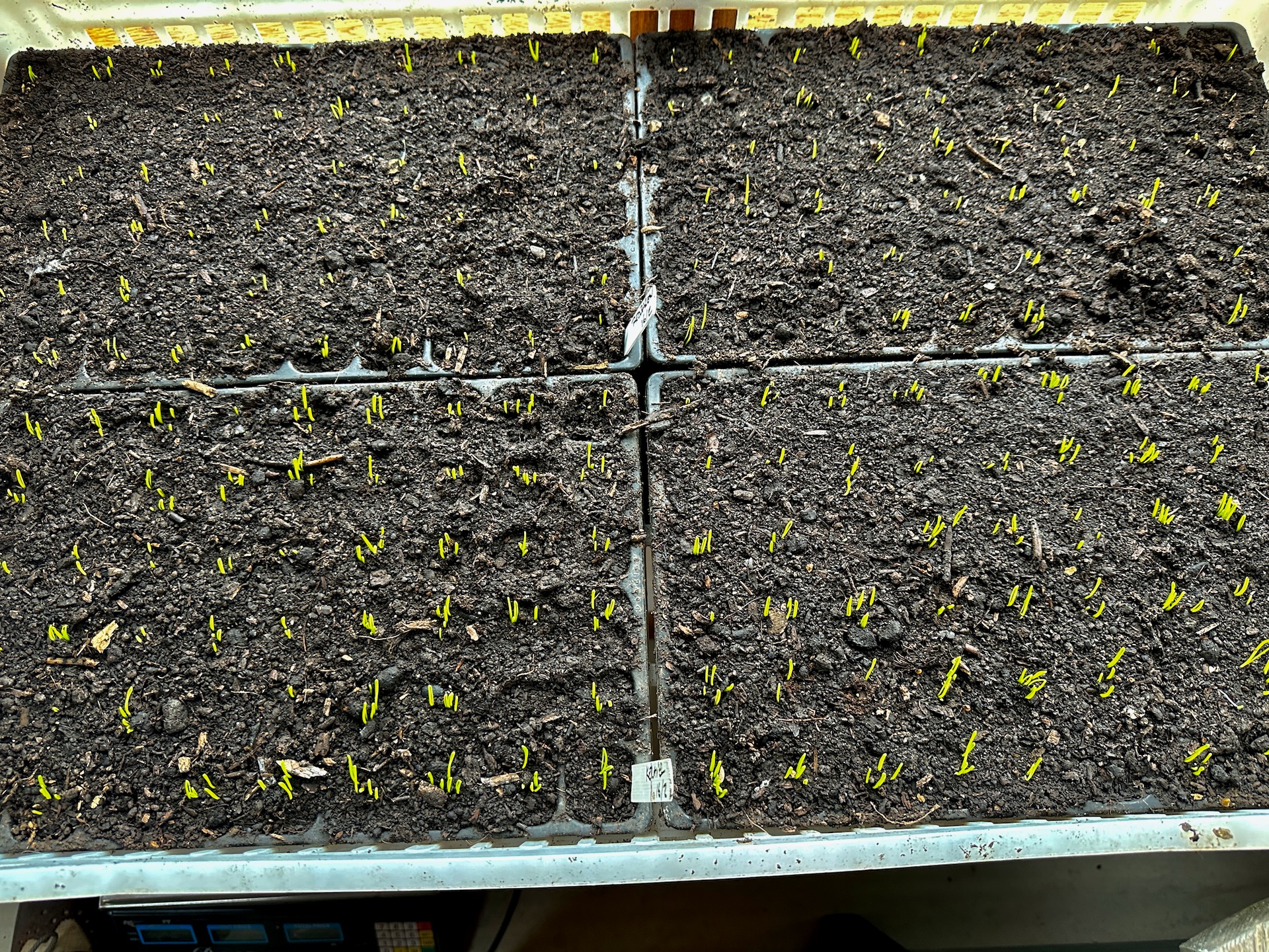It's still too cold for new sowings to germinate outside. Even under cover, which means in a greenhouse or polytunnel or cold frame, nights are on average too cold for most seeds to germinate. So either you need to germinate sowings in your house, or under cover with some warmth such as from a heat mat, or in my case from a hotbed of fresh manure, see photo below.