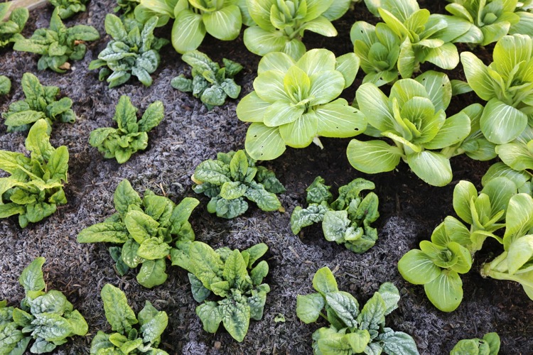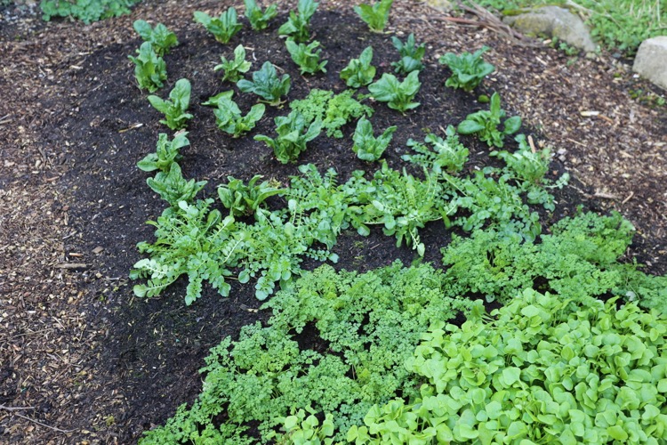 Salads amll garden planted last autumn, from front is winter pursland, chervil, lan cress and spinach at back, Medania