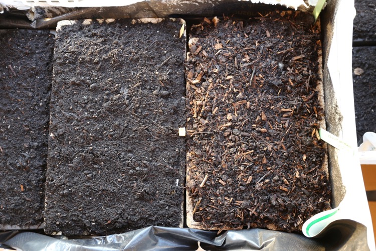Bought multipurpose compost on left, sieved homemade on right which still has enough undecomposed wood to slow seedling growth