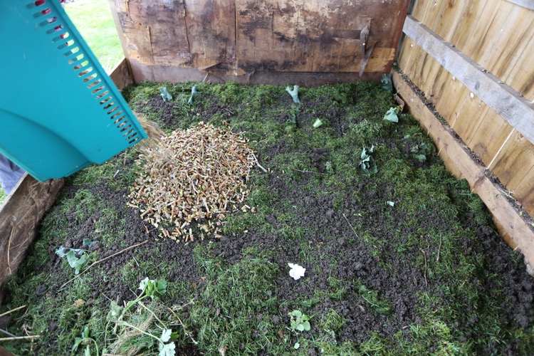 Compost heap March Homeacres, adding the apple tree prunings after shredding, mix of green and brown in the heap