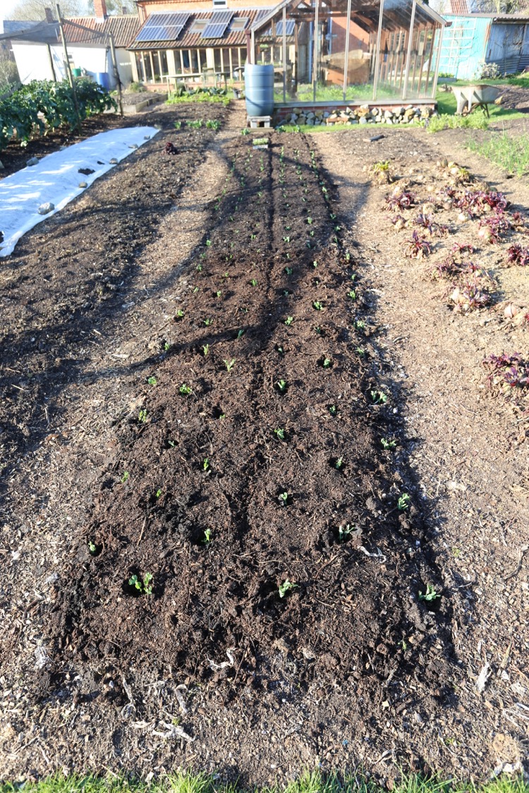 Small pea modules were 16 days old seedlings, popped into holes made by the dibber, guided by my lines