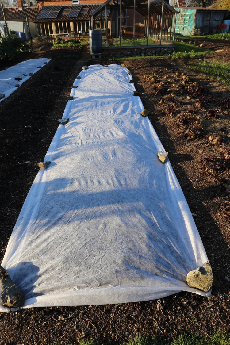 Bed fleeced over and held in place with some stones, fleece was already used in 2018, not washed!