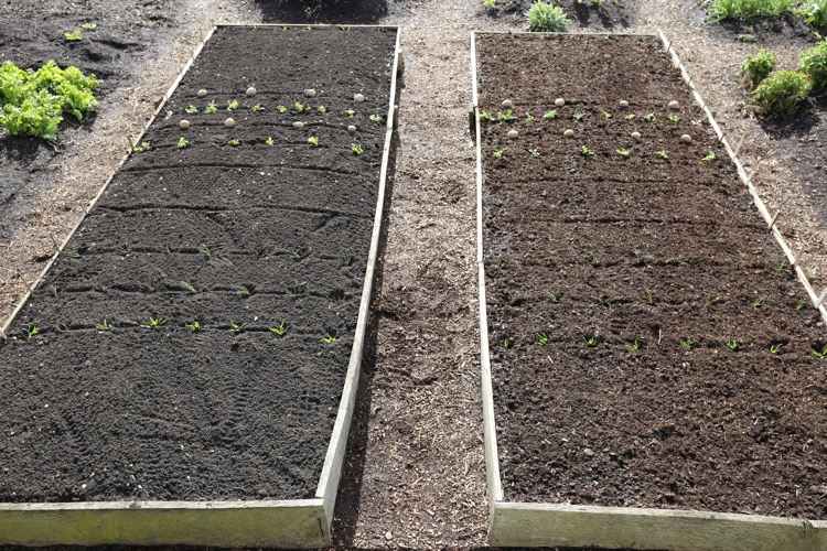 This is my thirteenth year of comparing growth in dig and no dig beds, side by side and with the same amount of compost. See this page for details. We made the first plantings 11th March, about half of both beds are planted so far.Last December I dug the left hand bed plus incorporated two large barrows of compost - 50% horse manure, 25% homemade and 25% mushroom compost. The same amount of compost simply went on top of the no dig bed. Both beds have been raked to disturb/kill baby weed seedlings and break up lumps.