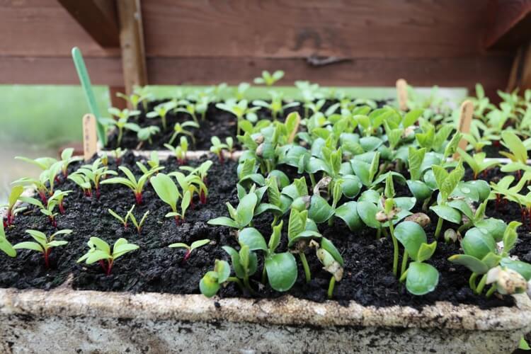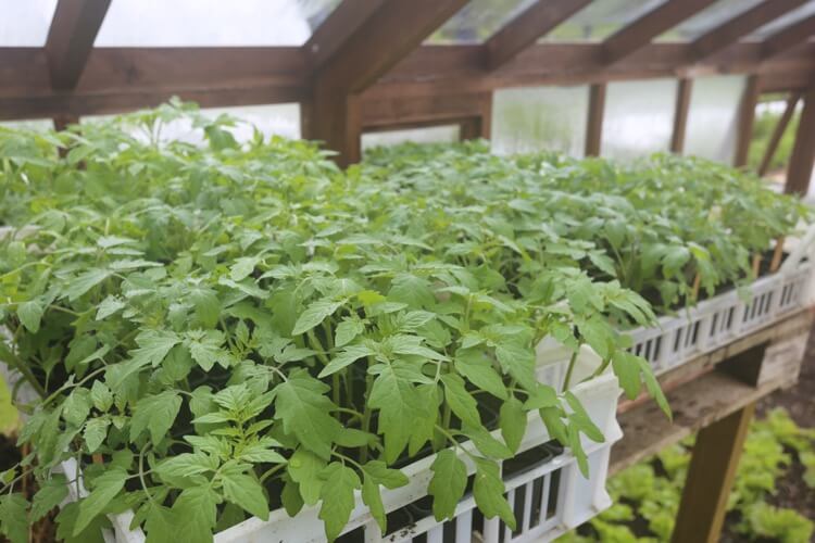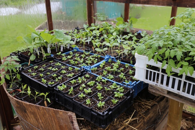 Photos of some growth at Homeacres, by 29th April. Seeds germinated in trays over the hotbed, which is at 45C/113F now.