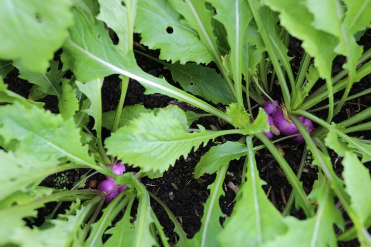 Turnips Sweetbell F1 are delicious raw, multisown 20th February and grown under fleece