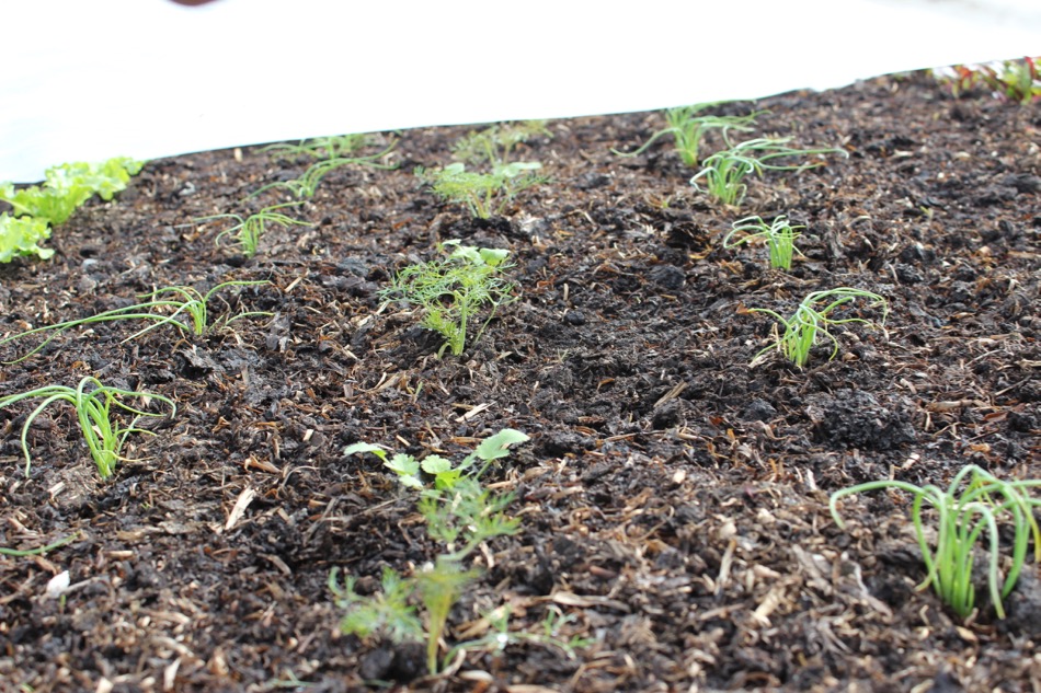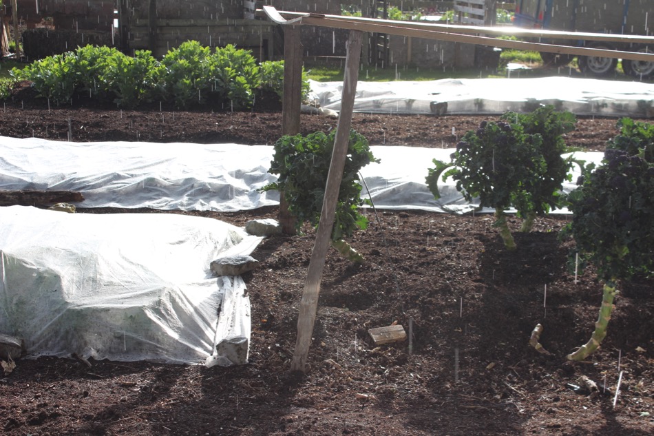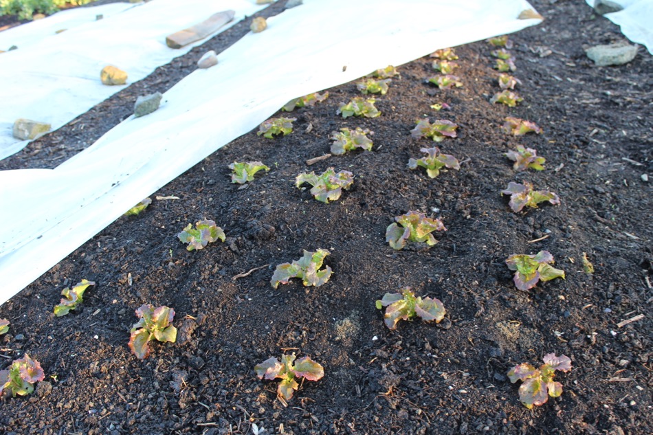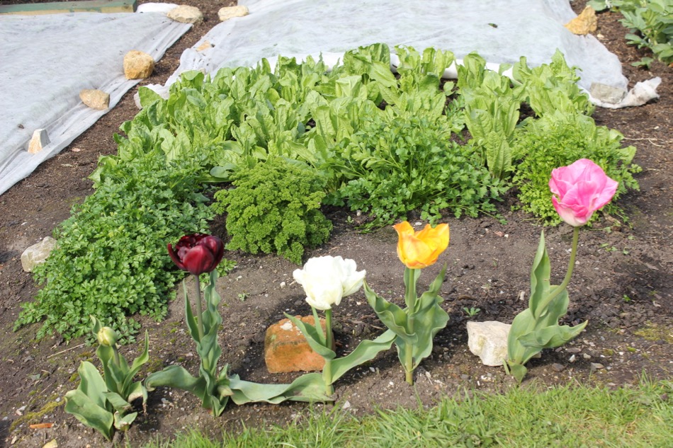 Homeacres looks white at present with more than half the beds recently planted and covered by fleece, which has made all the difference during days of cold winds and nights of frost. It does not keep all frost out, and there is crisping of leaves that touch frozen fleece, but it holds warmth at surface level by day. Also it protects plants from pigeons and rabbits.