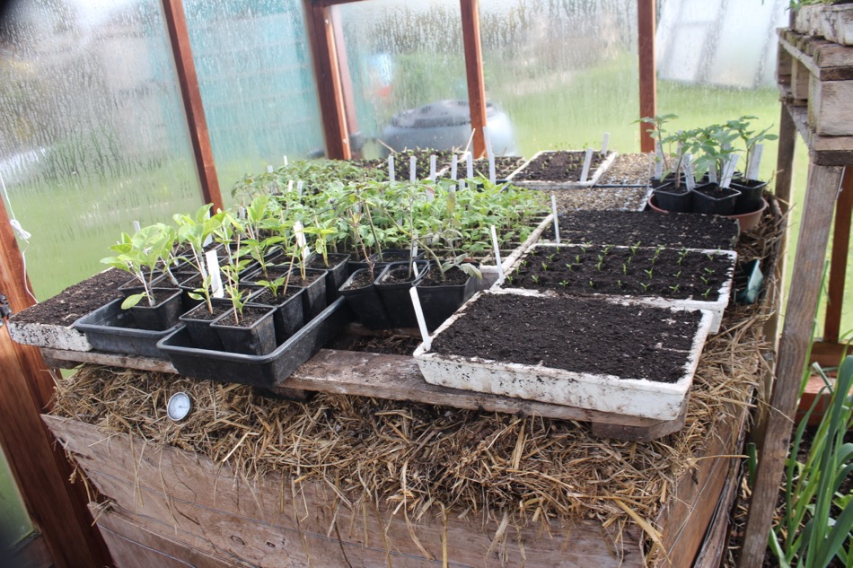 On 13th April we took everything off and piled two more barrows of day-old horse manure on top. The hotbed temp dropped to 30C before recovering. Now there are aubergine and pepper plants, with basil, cucumber and melon germinating, also the first courgettes.