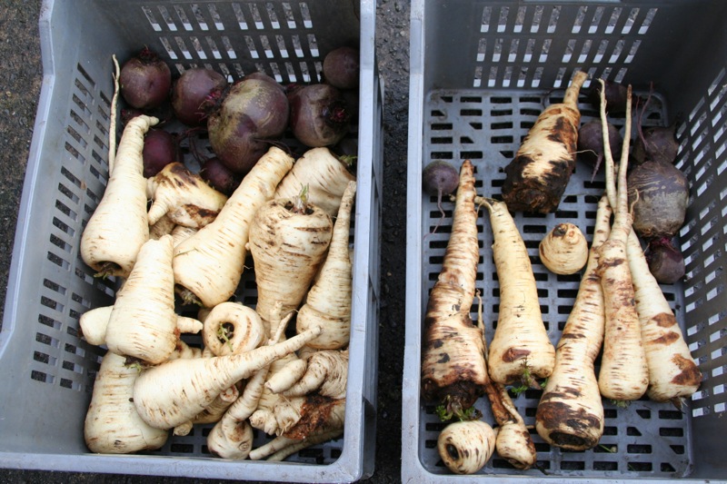 Compost-bed parsnips & beetroots on left, soil-bed on right
