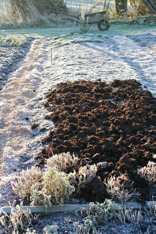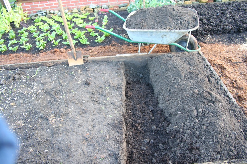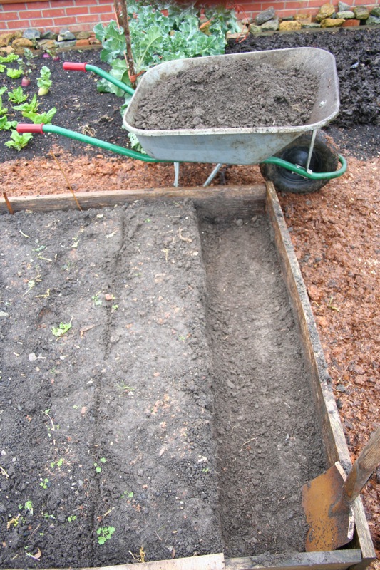 I have just dug (!) the 5x16 feet bed of my dig/no dig experiment. I put a trench of soil in a barrow, then add compost, then turn the next trench of soil onto it. After turning over the last trench at the bed's other end, I tip the barrow of soil onto its compost. That took 4 hours this year, quite quick as the soil is quite crumbly here, a nice loam over the clay.Then it took two hours to top the no-dig bed with compost - two fifths cow manure, three fifths municipal. I added five barrowloads to each bed, more than usual as I wanted their levels to come back to the top of the boards. The level of cropping justifies this, with 104kg vegetables off each bed this year.