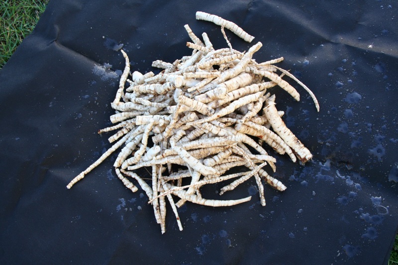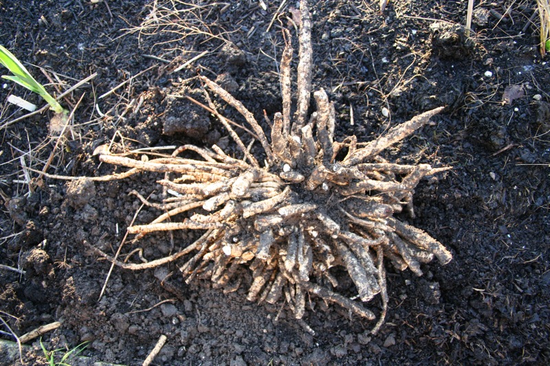 This is skirret, Sium sisarum. You can grow it from seeds, but I just dug up a two year old cliump whose stems had been six feet high. I found many shards of glass in doing this, from Homeacres old greenhouses. There were plenty of roots, but they are a real fiddle to cut off and wash. Apparently you cook them like carrot and parsnip, I lke their taste raw.I then replanted the residue skirret in a different place, it was overshadowing some nearby asparagus.