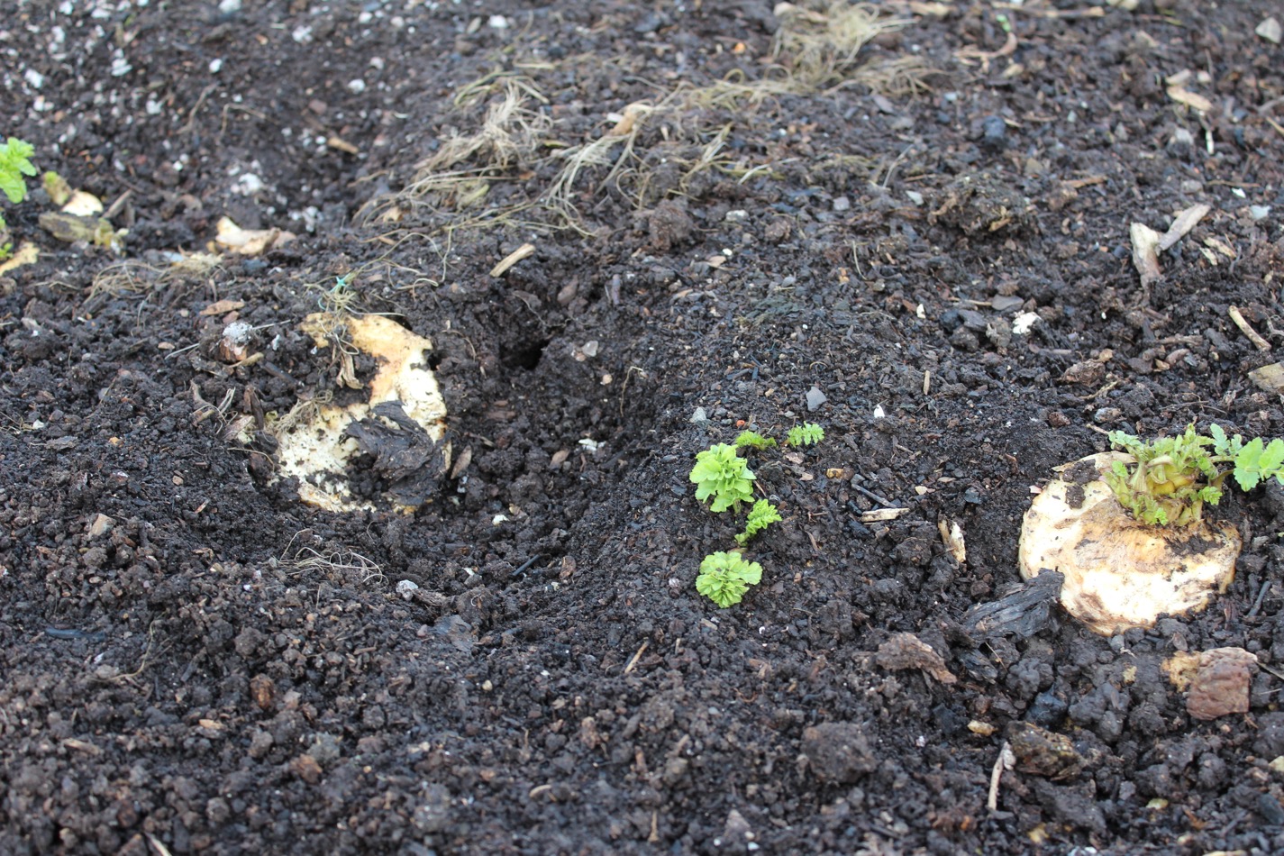 New bed on pasture: creeping buttercup growing through a soil/compost mulch