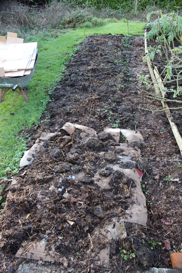 You can choose from the many possible combinations of cardboard and other organic matter, soil too if you have some (its not worth buying in). In the pics we spread 3in soil and 2in year-old cow manure on top of grass, dandelion and creeping buttercup, in October last year. Then I planted raspberry canes.Now the buttercup are growing through in places. Perhaps if I had put cardboard before the mulch, it would not be growing, though from autumn mulching, which gives time for card to soften before the buttercups regrow in late winter, it might have made less difference.Whatever, I am now laying cardboard on top as soon as I can find some!