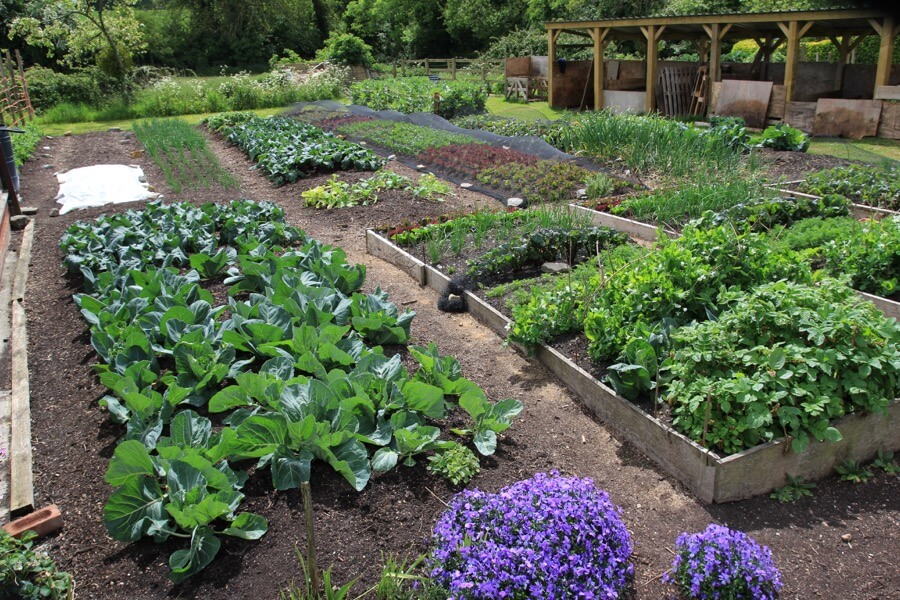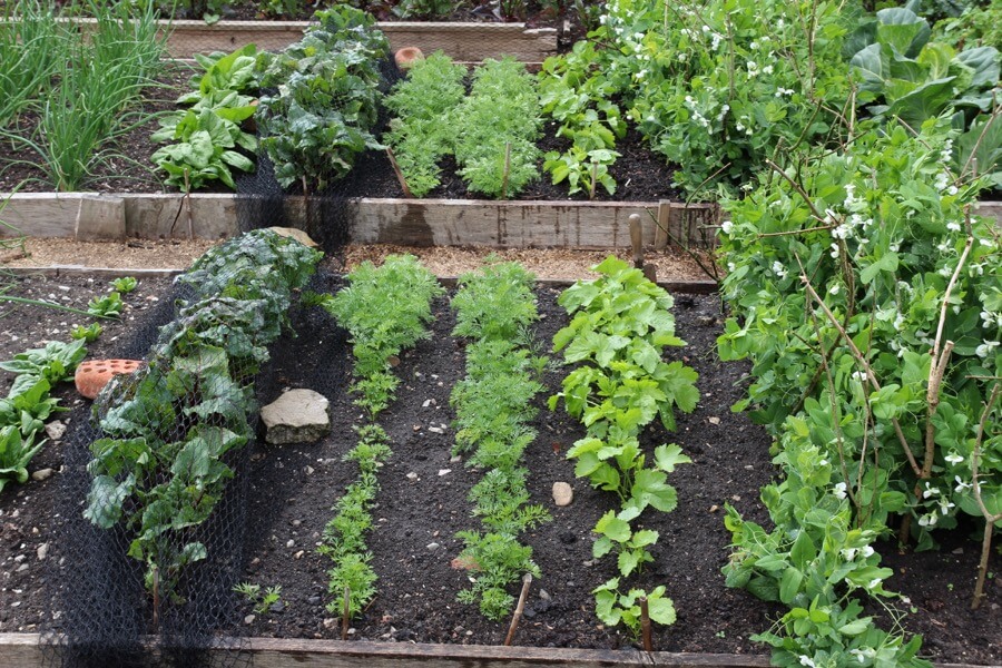 View on 12th May with violas self seeded in front, then cabbage & calabrese on left