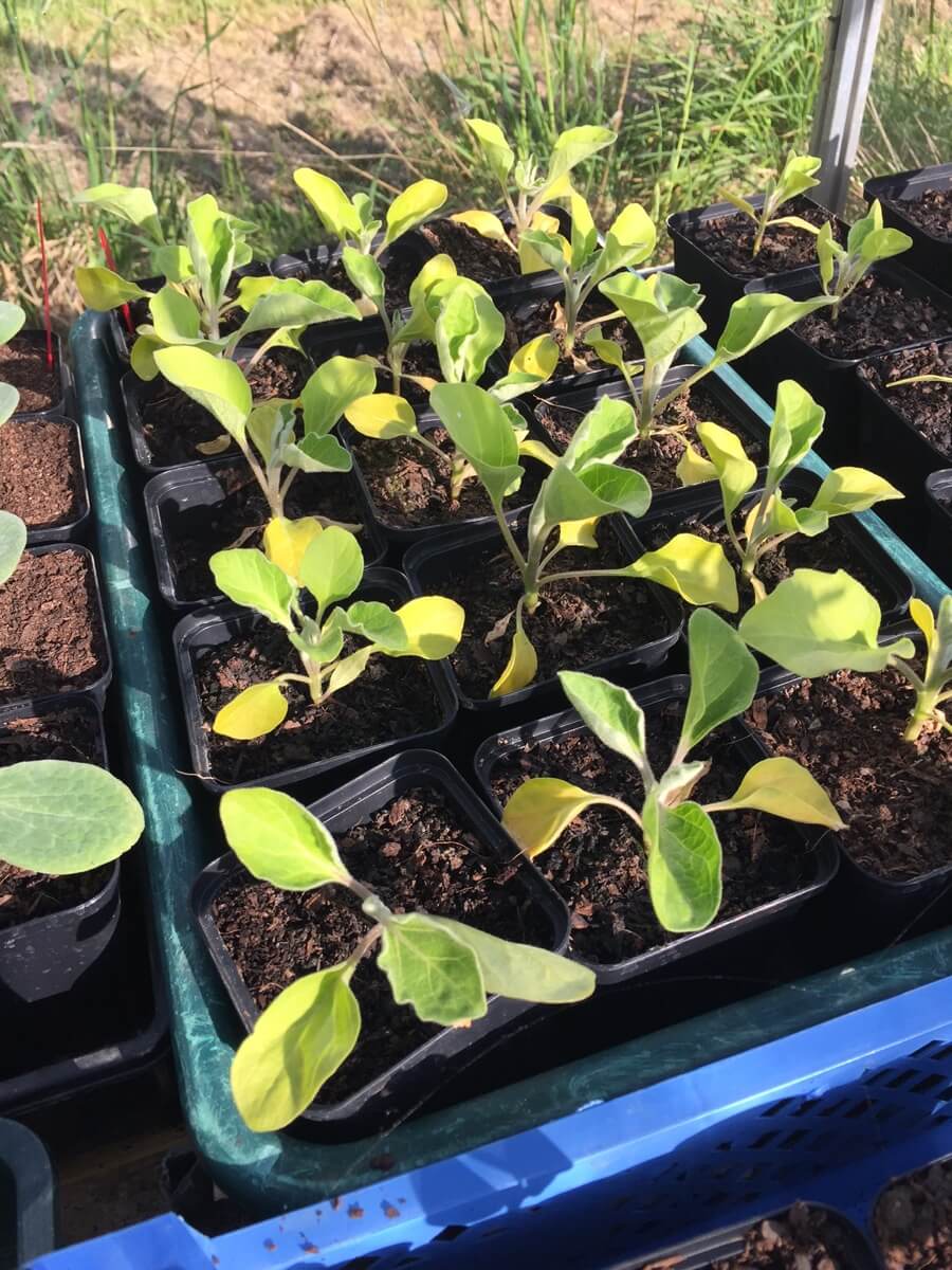 For most of us, the tender plants can now go out, but it’s early June for some colder northern areas. This week we are planting 3-4 week old courgettes, squash and sweetcorn, and French + runner beans at month’s end.In greenhouses and polytunnel it’s good to plant tomatoes, cucumber, aubergines, peppers and chillies, any time during the next month. And basil too.If you have plants looking like the aubergines below, they need repotting or planting out. When lower leaves start to yellow, there is no food left in the compost and growth stops! Many composts based on wood fibres are lower in nutrients than ones based on peat.