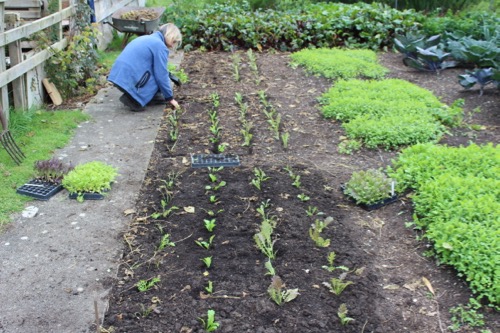 We are making final plantings of Grenoble Red lettuce, Fine Maraichere endive, mustards, salad rocket, leaf radish, chervil, coriander and claytonia which were sown in September. They are bursting out of their module trays and keen to find the ground. Prior to planting and after clearing tomatoes etc, I walk on the compost-covered soil to firm it back again, also to break any surface lumps, then water thoroughly before planting. Josh Rogers has been helping with this. I add no more compost until next May (three inches at that time), finding that once a year is enough for both summer and winter crops, with no other feeds or fertiliser given, at any time.
