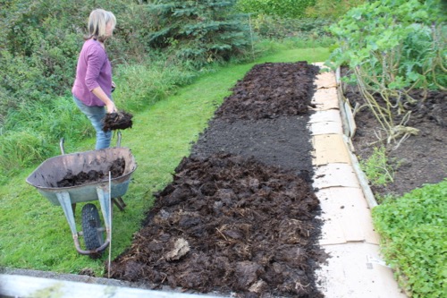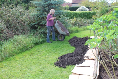 Here are some photos to illustrate how we just made a new bed, no dig. A neighbour had given me topsoil from an unwanted raised bed, and three inches of that went straight on top of weedy pasture, after laying cardboard where the path will be. Then a two inch layer of half rotted cow manure - this bed is for raspberries. We fished through a heap of delivered cow manure to use up the more strawy lumps, then shall be spreading the more decomposed remainder on beds for vegetables.