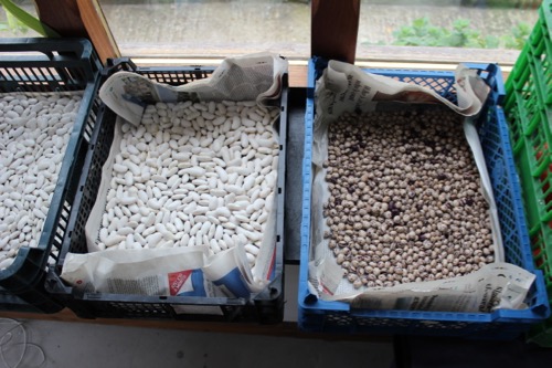 Our lovely butter beans of Czar runner bean plants, and Borlottis too, have been drying on the plants, to harvest once they ripen. With the Czar I usually pick the pods when yellow or brown, shell them out (helped by Charlie & Josh this week) and lay the beans in trays on a sunny windowsill until dry. You can also pick them when pods are green, for eating the the white Czar or borlotti beans fresh, they are delicious.