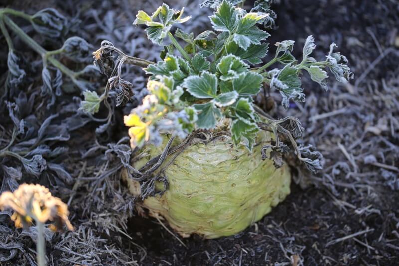 Prinz celeriac in -2C/28F, they withstand much frost but the leaves are dying from Septoria, not damaging but common in autumn