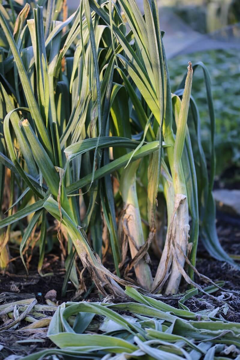 Multisown leeks planted as small module seedlings much more shallowly than normally recommended, easy to pull