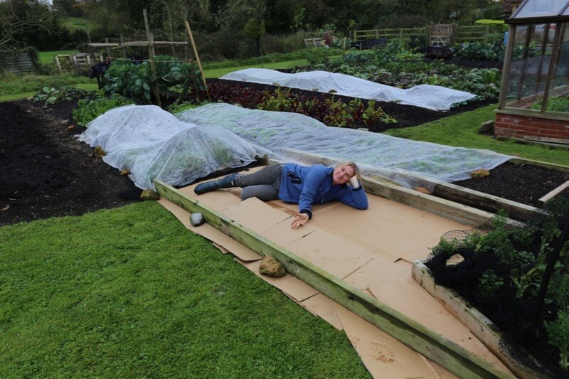 For flowers, less compost is needed as annual dressing, but it’s still worth using 7-15cm/3-6in for bed creation in year one, see below. If using 15cm/6in you don’t need cardboard and yet we did, I had a surplus.