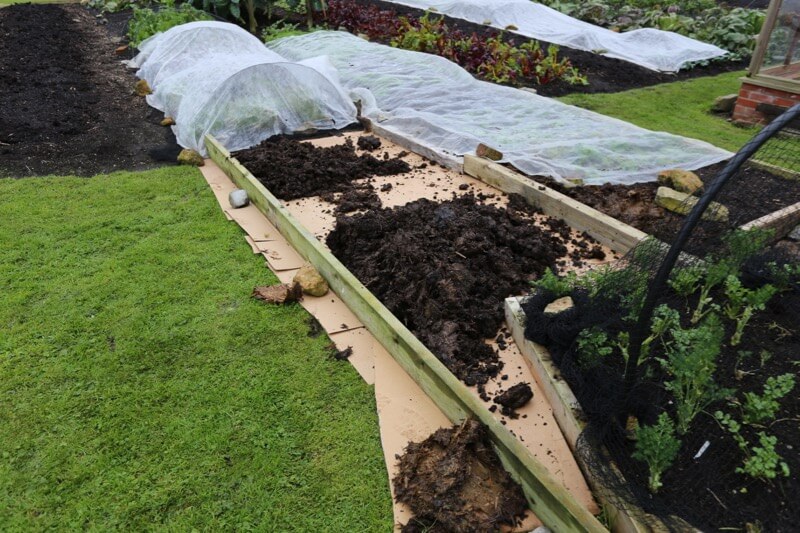 For veg I spread up to 5cm/2in compost, the finer the better but rougher lumps are possible in autumn, just break them up as much as you can, before spreading. Weather continues the breakdown. This is the only feed I give all year! Saves time.