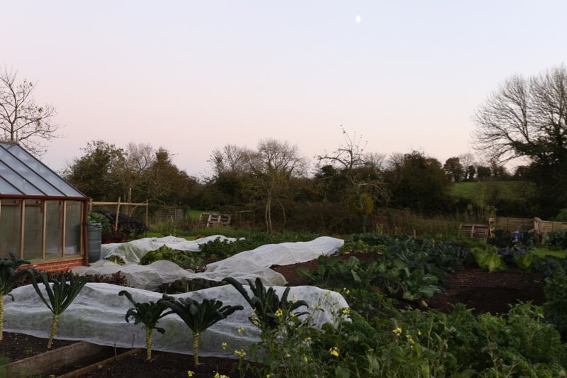Moon over Homeacres 29th October, some veg fleeced before frost