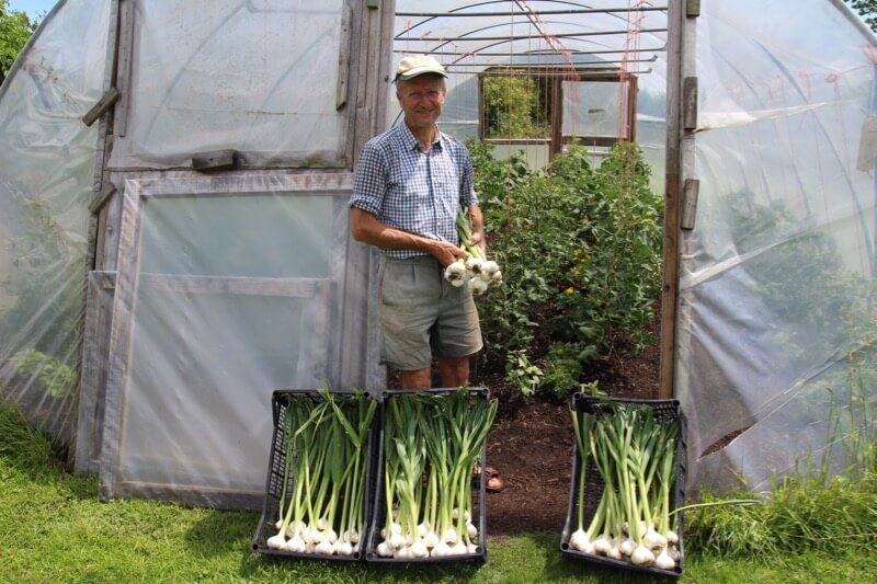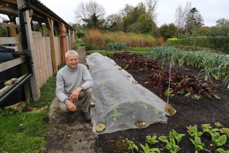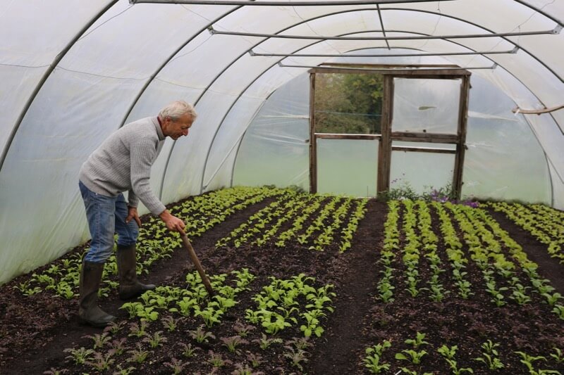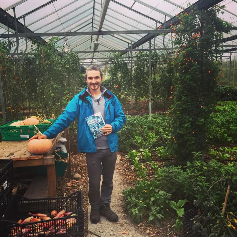 Oisin in his 30 year old, recently erected glasshouse, all no dig, is holding a well thumbed copy of my first book