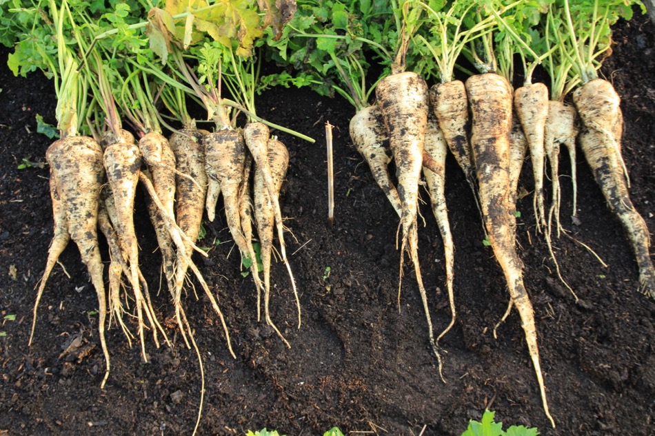 Parsnip harvest from dug bed on left, no dig on right: parsnip harvest October from 2.5ft .75m row dug parsnips 5.59kg, no dig 6.82kg inc one of 1.26kg, 2lb 12oz